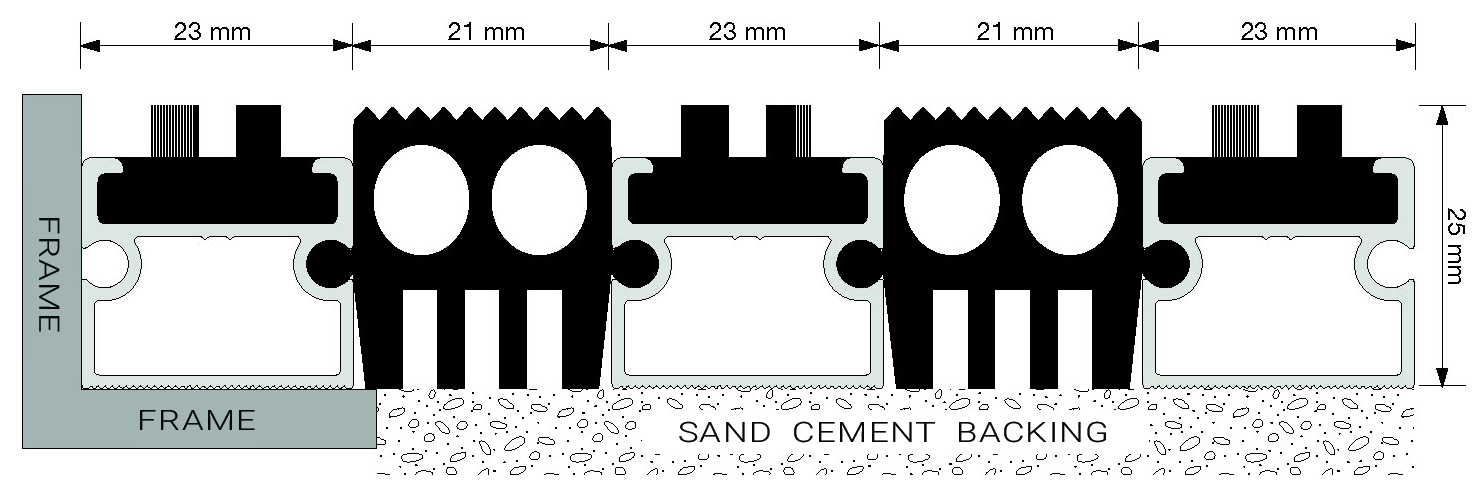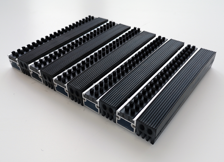 Structure in strong tubolar alluminium profiles joined by a laminated rubber EPDM profile. No space between the slats (closed mat). lining