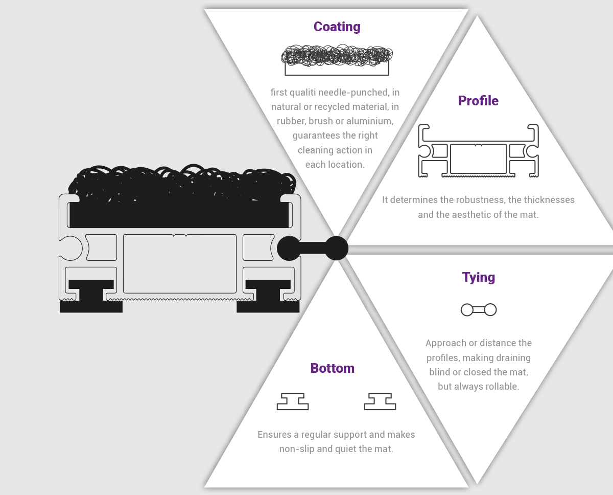 Mat.en’s entrance matting are made through the combination of 4 elements thanks to which you can produce the ideal mat for each entrance and transit.