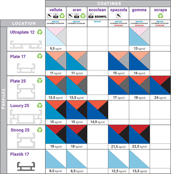 Thanks to the different tickness avaiable (12,17 or 25mm), to the double width of the profiles (23 or 41mm), to the section of themself (1,2 e 2,2mm), to the different materials (aluminium, recyled aluminium or PVC), to the different coatings (Velvet or Aran needle punched, black rubber, nylon, brush, knurled aluminium and ecologic felt) Mat.en’s range of products is suitable for any situation and transit.
