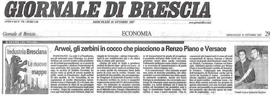 Dal 1983 ad oggi, la società di Delfino Facchini, ha messo sotto i piedi di mezzo mondo la griffe “made in piamborno” degli zerbini di alta qualità. In via Vanzolino, in un capannone di medie dimensioni, incontriamo Luca e Giancarlo, 23 e 26 anni, che hanno accettato la sfida di un passaggio di consegne che si perfezionerà negli anni a venire. “Papà ha cominciato quasi per caso agli inizi degli anno Ottanta, dopo un viaggio in Germania – spiega Giancarlo-. Aprì il suo stabilimento qui e da allora non ci siamo più spostati”.