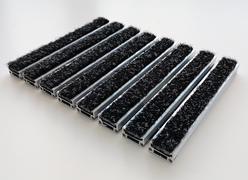 Struttura in robusti profili tubolari di alluminio uniti da canaline in termoplastico ad alta resistenza asolate o chiuse. Certificazione antiscivolo R-12 in accordo alla norma DIN 51130. Spazio fra le doghe 7 o 4 mm. Rivestimento in agugliato monofilo dall’aspetto velluto. Spessore 17 mm. c.a.
