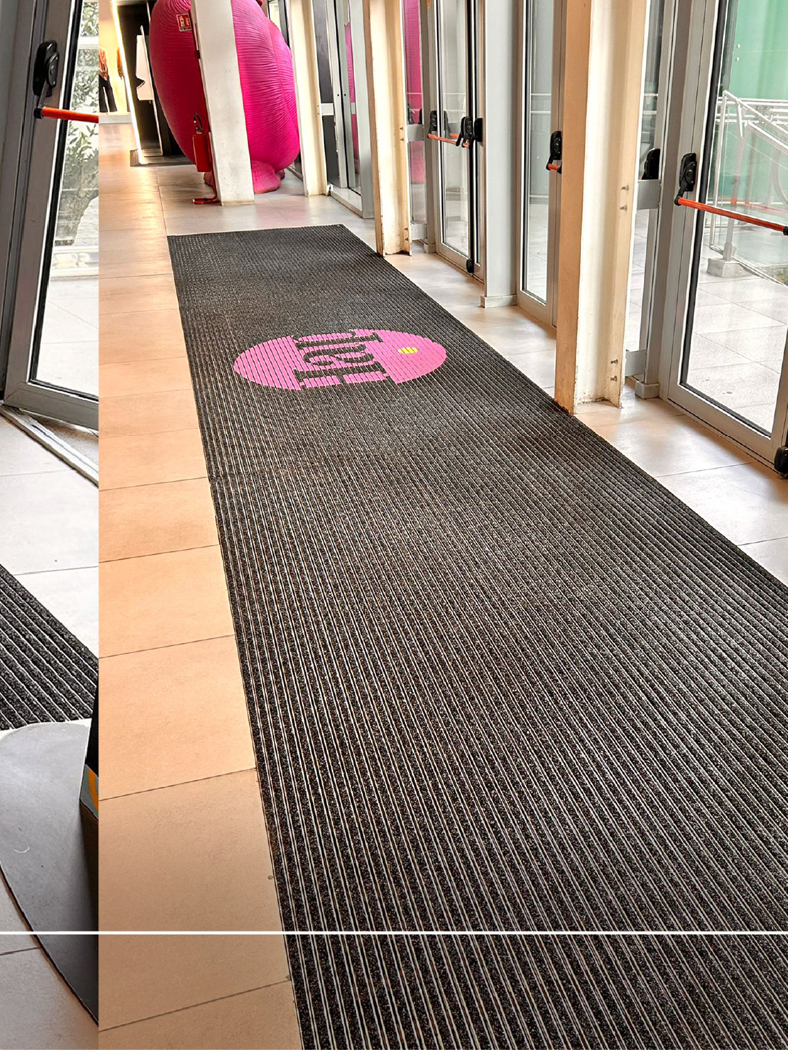 Per una brandizzazione ancora più forte degli ingressi i tappeti tecnici sono stati personalizzati con l’intarsio del logo del centro commerciale sfruttando la vasta paletta di colori disponibili sugli zerbini tecnici Mat.en.