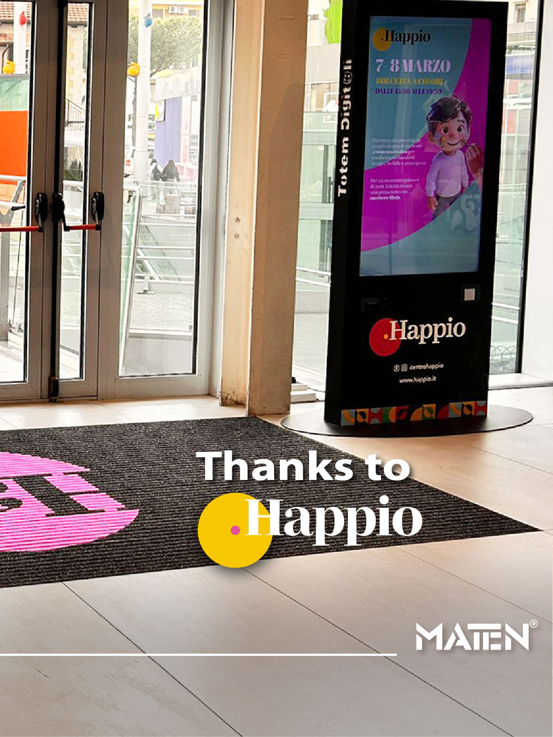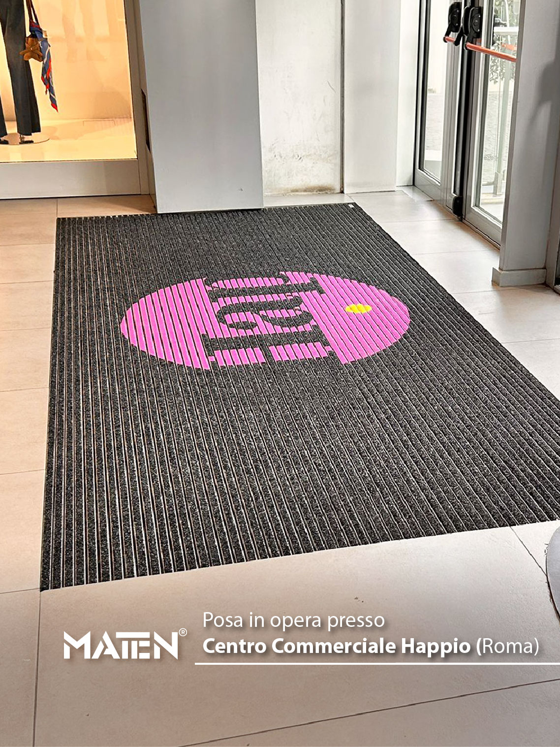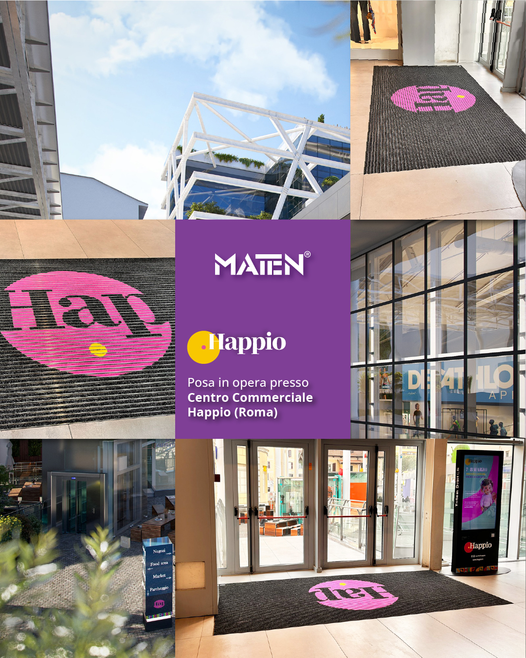 Mat.en ha recentemente completato la realizzazione e installazione di zerbini tecnici in alluminio personalizzati per gli ingressi del Centro Commerciale Happio di Roma, una struttura commerciale moderna caratterizzata da un elevato flusso quotidiano di visitatori.