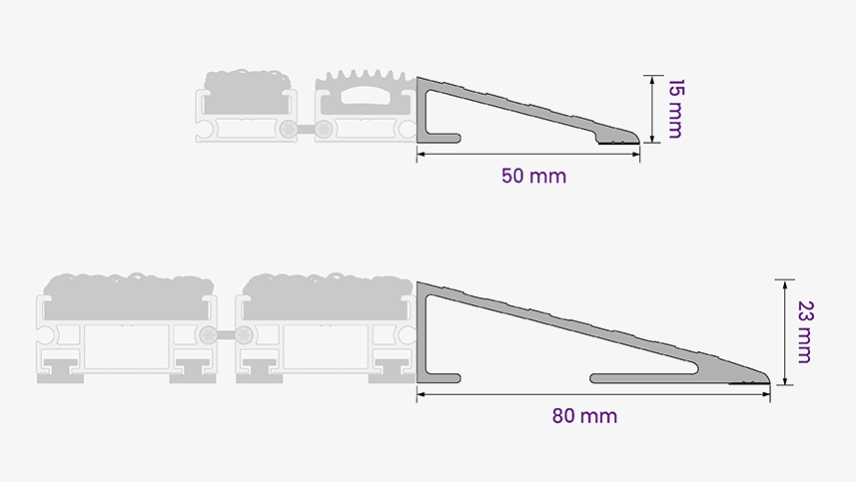 Disponibili in varie forme e formati, spessori e profondità sono adatte sia per gli zerbini tecnici in alluminio sia per tappeti più tradizionali quali il cocco sintetico, il ricciolo di vinile o il cocco naturale.