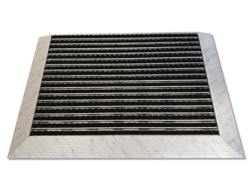 Infatti, posando trasversalmente allo zerbino una corsia realizzata sempre con i tappeti tecnici Mat.en, si può creare un percorso tattile che, se realizzato con il profilo Scrape verniciato con una speciale finitura fotoluminescente, oltre a fare da guida per gli ipovedenti segnala in maniera luminosa, senza l’ausilio di corrente elettrica, la via di fuga illuminandosi nel momento in cui dovesse spegnersi la luce nella stanza.