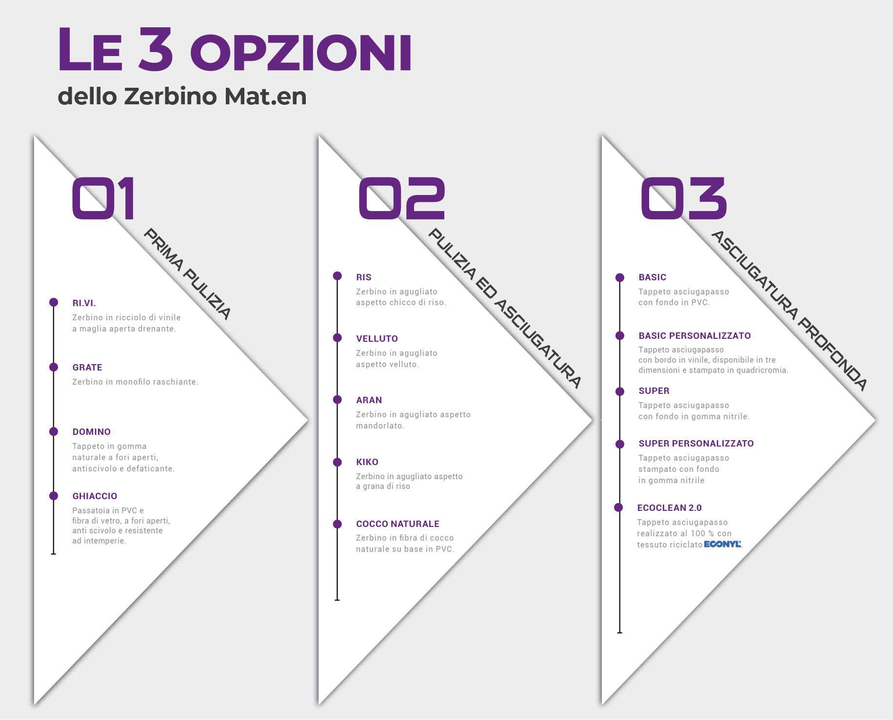 La gamma di prodotti è molto vasta e si declina nel Cocco Naturale (di provenienza esclusivamente europea), intarsiato o neutro, nel Cocco Sintetico in fibra outdoor disponibile in 3 diverse finiture (Velluto, Aran, Grate, Ris e Kiko) e tantissimi colori per intarsi fedeli del logo, ed il Ri.Vi. (ricciolo di vinile), realizzato solo con materiale vergine per la massima robustezza e duratura del tappeto, anch’esso personalizzabile tramite intaglio.